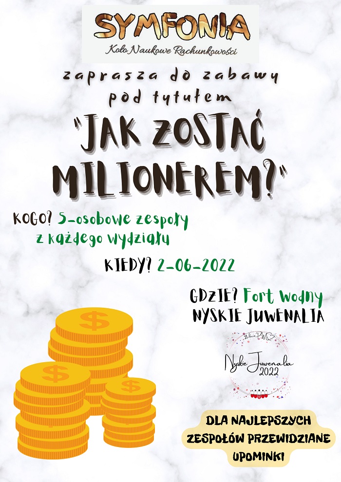 Koło Naukowe Rachunkowości "SYMFONIA" zaprasza do zabawy pt.: "JAK ZOSTAĆ MILIONEREM?" w czasie NYSKIE JUWENALIA 2022 21-lecie PWSZ w Nysie.
