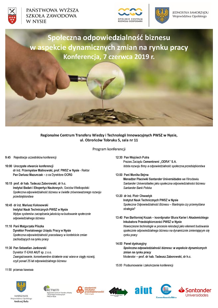 RCTWiTI PWSZ w Nysie  wraz z Instytutem Nauk Technicznych PWSZ w Nysie, Akademickim Inkubatorem Przedsiębiorczości PWSZ w Nysie i Opolskim Centrum Rozwoju Gospodarki  zapraszają przedsiębiorców, przedstawicieli instytucji otoczenia biznesu, władz lokalnych, studentów, młodzież oraz mieszkańców regionu nyskiego do udziału w konferencji dot. społeczność odpowiedzialności biznesu w aspekcie dynamicznych zmian na rynku pracy, która odbędzie się 07.06.2019 (piątek) w godzinach od 10 do 15 w sali konferencyjnej nr 11 w budynku RCTWiTI PWSZ w Nysie przy ul. Obrońców Tobruku 5.