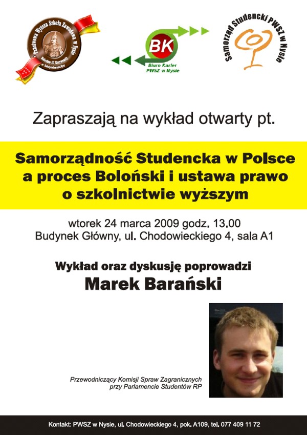 PWSZ w Nysie, Biuro Karier przy PWSZ w Nysie oraz Samorząd Studencki PWSZ w Nysie zapraszają na wykład otwarty pt.