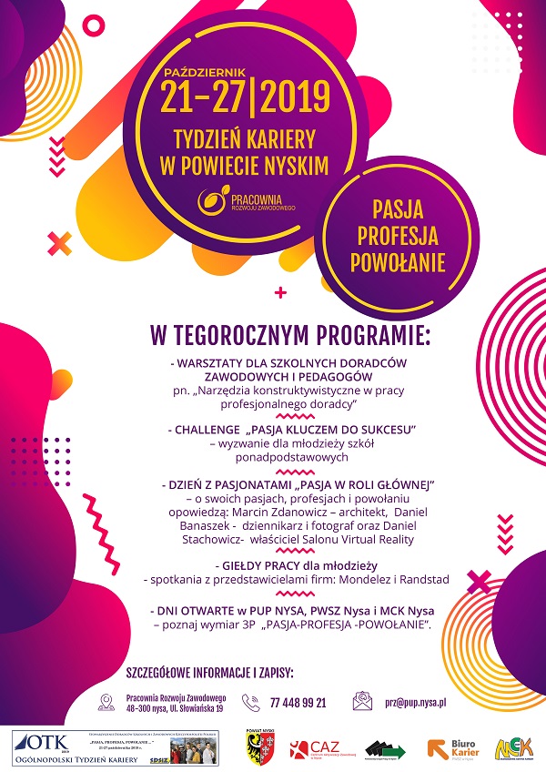 "Pasja, Profesja, Powołanie" - to hasło przewodnie tegorocznego Ogólnopolskiego Tygodnia Kariery które odbędzie się w dniach 21-25 X 2019 r.