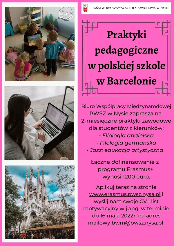 Zapraszamy studentów PWSZ w Nysie do skorzystania z oferty praktyk nauczycielskich w ramach programu Erasmus+ w Szkole Polskiej w Barcelonie, Gironie i Tarragonie w Hiszpanii. Dofinansowanie na 2 miesiące z programu Erasmus+ wynosi 1200 euro. Termin realizacji praktyk: wrzesień - październik 2022.