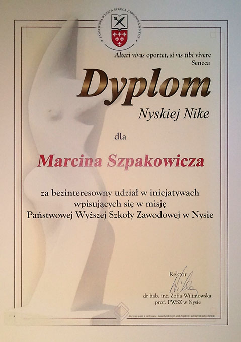 W dniu 15.06.2012 podczas Uroczystości rozdania dyplomów absolwentom kierunku ZIP nasz absolwent Rafael Baraniewicz otrzymał wyróżnienie Państwowej Wyższej Szkoły Zawodowej w Nysie dla Absolwentów i Dobroczyńców Uczelni, tzw. Nyską Nike.